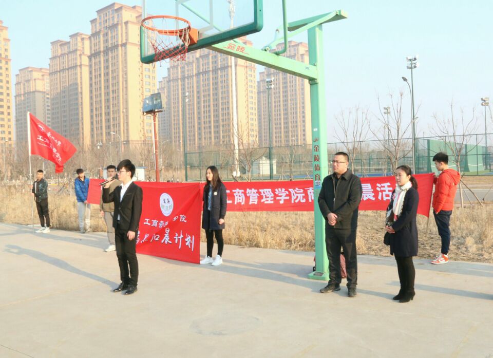 学生会主席申城玮详细阐释了活动内容和意义,活动计划历时3个月,利用每天清晨20分钟有效时间,通过必修选修相结合的方式,开展竞技类、素拓类以及兴趣小组活动类体能课程。呼吁学生要持之以恒,养成良好的作息习惯。学生代表秦杨湄宣读了活动倡议书,倡议学生们坚持早起,认真参与,将学习与锻炼有机结合,并代表学生宣誓。杨光为本次商英启晨计划揭幕,各班级负责人在条幅上写下本班名称及口号,商英启晨计划正式启动。