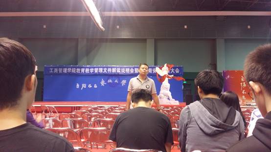 随后,王寰告知与会学生由于工作调动问题,2014级辅导员将由杨光接任。王寰回忆了过去三年与2014级同学的情谊,以鞠躬的方式表达了深深不舍和美好祝愿,并对杨光进行介绍。