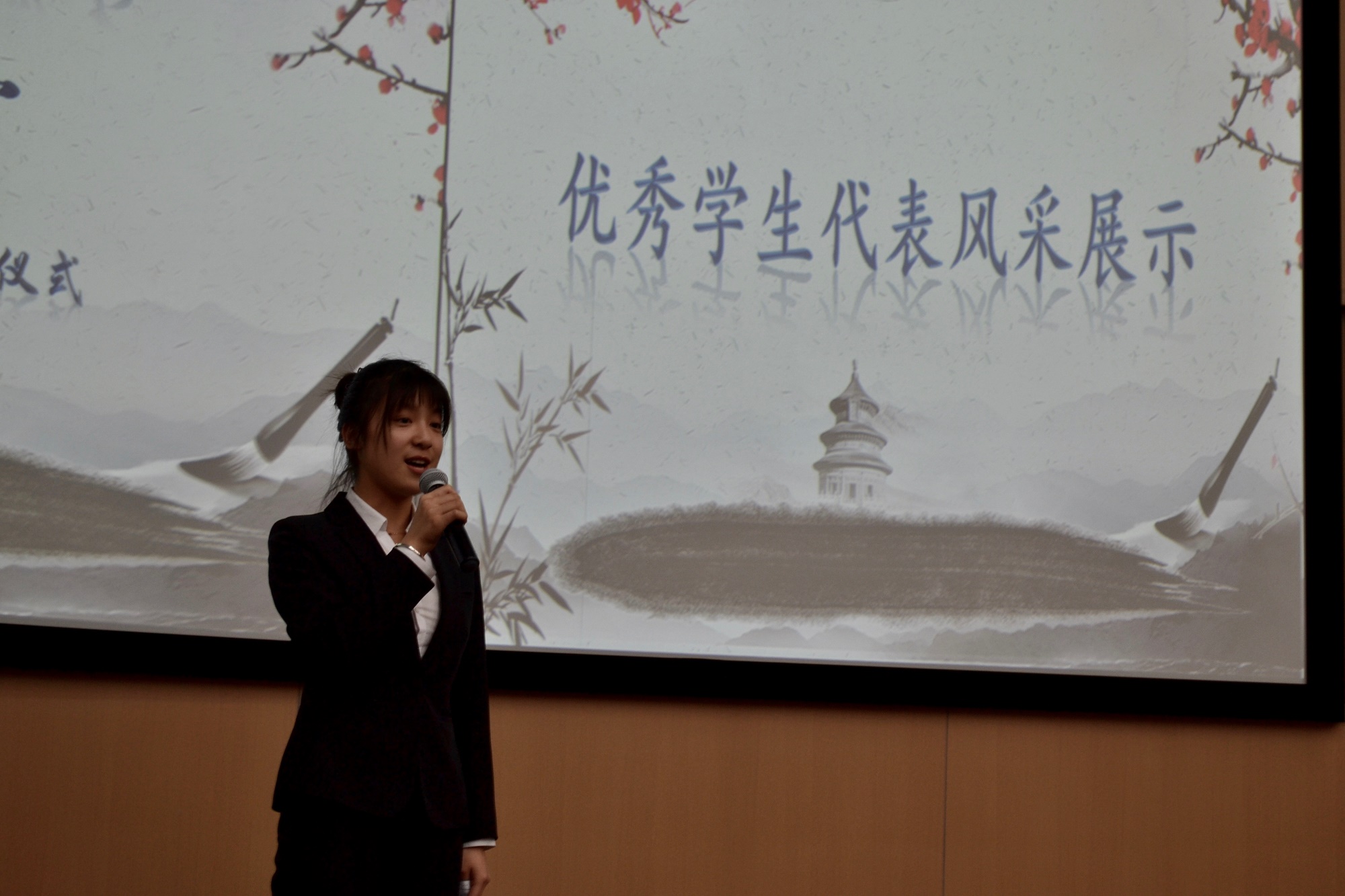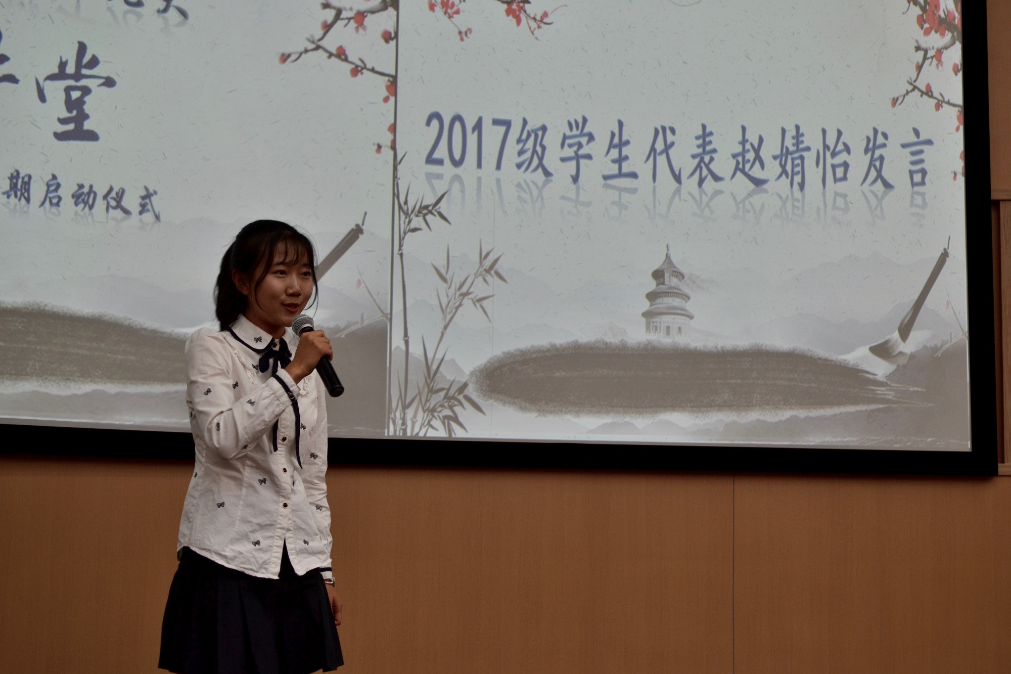 2017级本科生赵婧怡作为新生代表进行发言,表达了作为青年学生要把握机遇,大胆锻炼,努力提升。并号召2017级全体同学认真准备、积极展现,在活动中得到真正的提升。